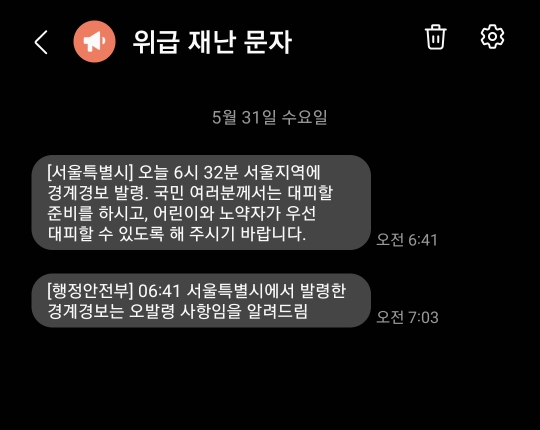 오전에 발송된 재난문자는 오발령 사항임을 알려드림.