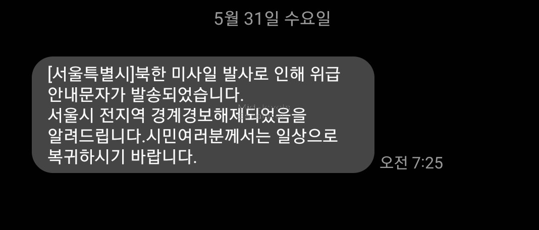 이번에는 북한 미사일 발사 문자로 인해 위급 안내 문자가 발송 되었지만 경계경보 해제 되었음을 알려드리는 문자로 긴급재난문자 형식이 아닌 발신처가 [안전문자]형식으로 왔습니다.